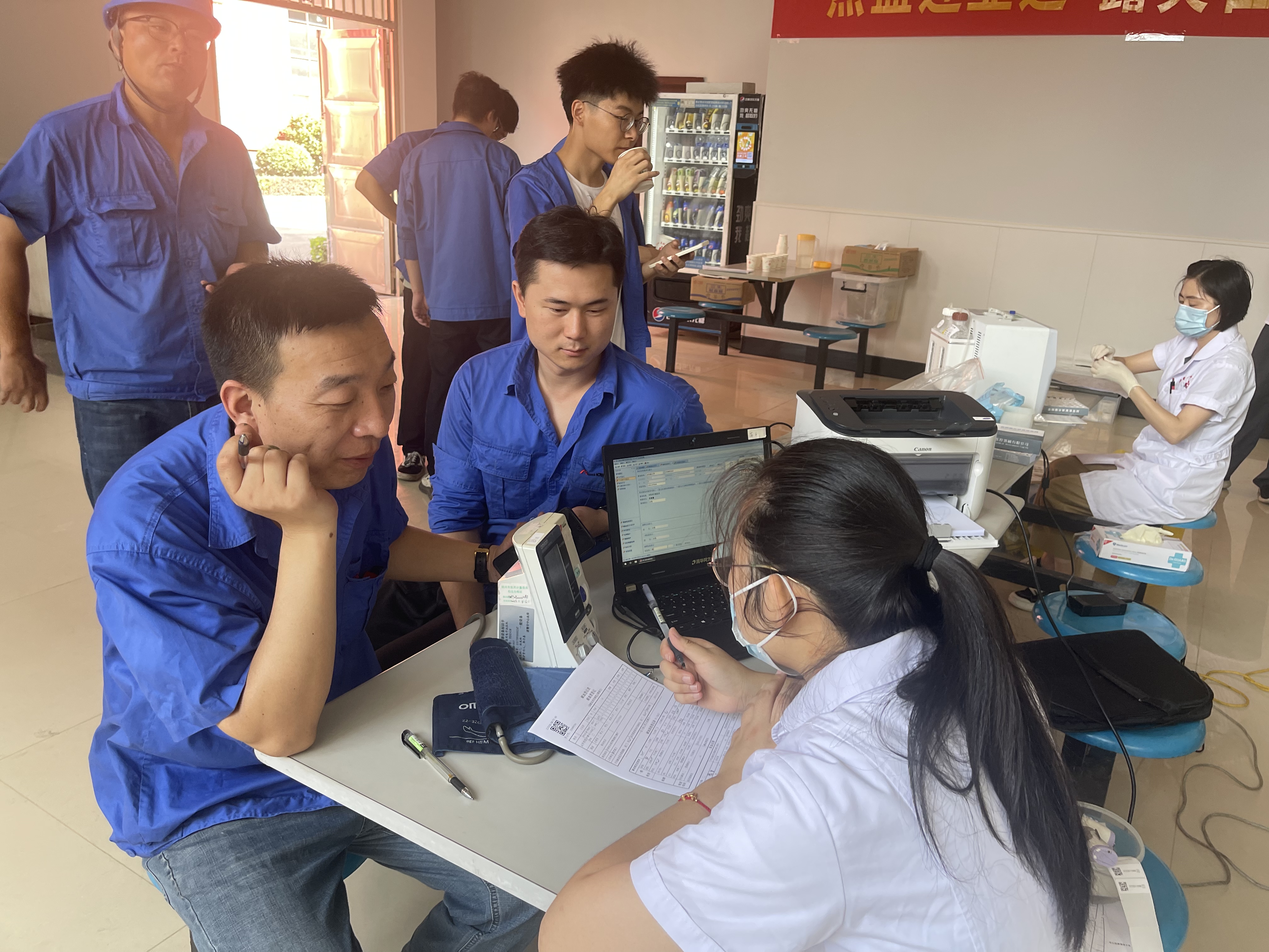 7月7日上午8点,参与献血的员工在医护人员的引导下有序进行献血准备工作,扫码登记信息、健康征询、采血化验、核对信息、测量血压等。
